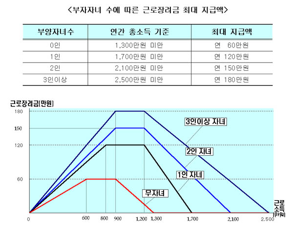 µû¶ó¼ ºÎ¾çÀڳడ ¾ø°í ¿¬°£ ÃѼҵæÀÌ 1300¸¸¿ø ¹Ì¸¸ °¡±¸¿¡´Â ÃÖÀú ¿¬ 60¸¸¿øÀÇ ±Ù·ÎÀå·Á±ÝÀÌ Áö±ÞµÈ´Ù. Àڳడ 3¸í ÀÌ»óÀÌ°í ¿¬°£ ÃѼҵæÀÌ 2500¸¸¿ø ¹Ì¸¸ °¡±¸¿¡°Ô´Â ¿¬°£ ÃÖ´ë 180¸¸¿øÀ¸·Î ±Ù·ÎÀå·Á±ÝÀÌ È®´ëµÈ´Ù.